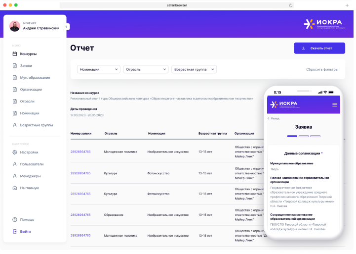 С помощью нашей системы вы можете создавать конкурсы, настраивать заявки по необходимым данным, провести анализ и отбор заявок, выгрузить отчет и оценить результат.