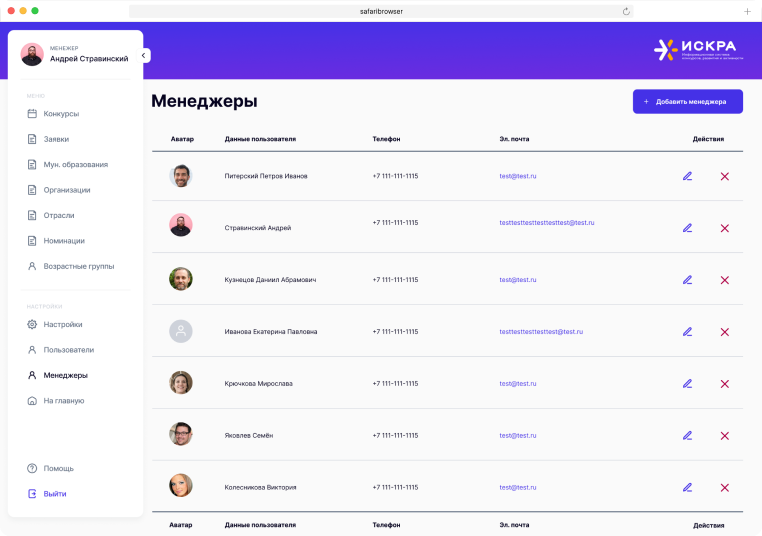 В “Информационной системе для проведения конкурсов” есть несколько ролей: администратора, менеджера и пользователя. Каждая из ролей обладает уникальным функционалом для решения определенных задач.